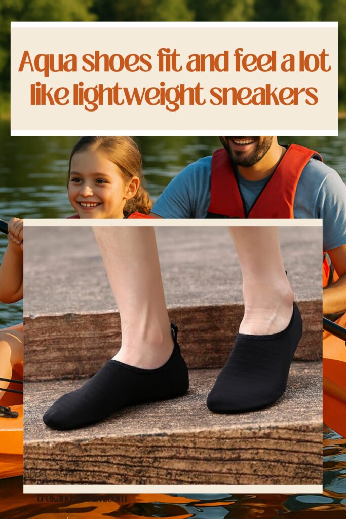 The WateLves aqua shoes feel more like lightweight sneakers. They’re quick-drying, have a flexible rubber sole, and are built for walking across sand, gravel, or into the water.